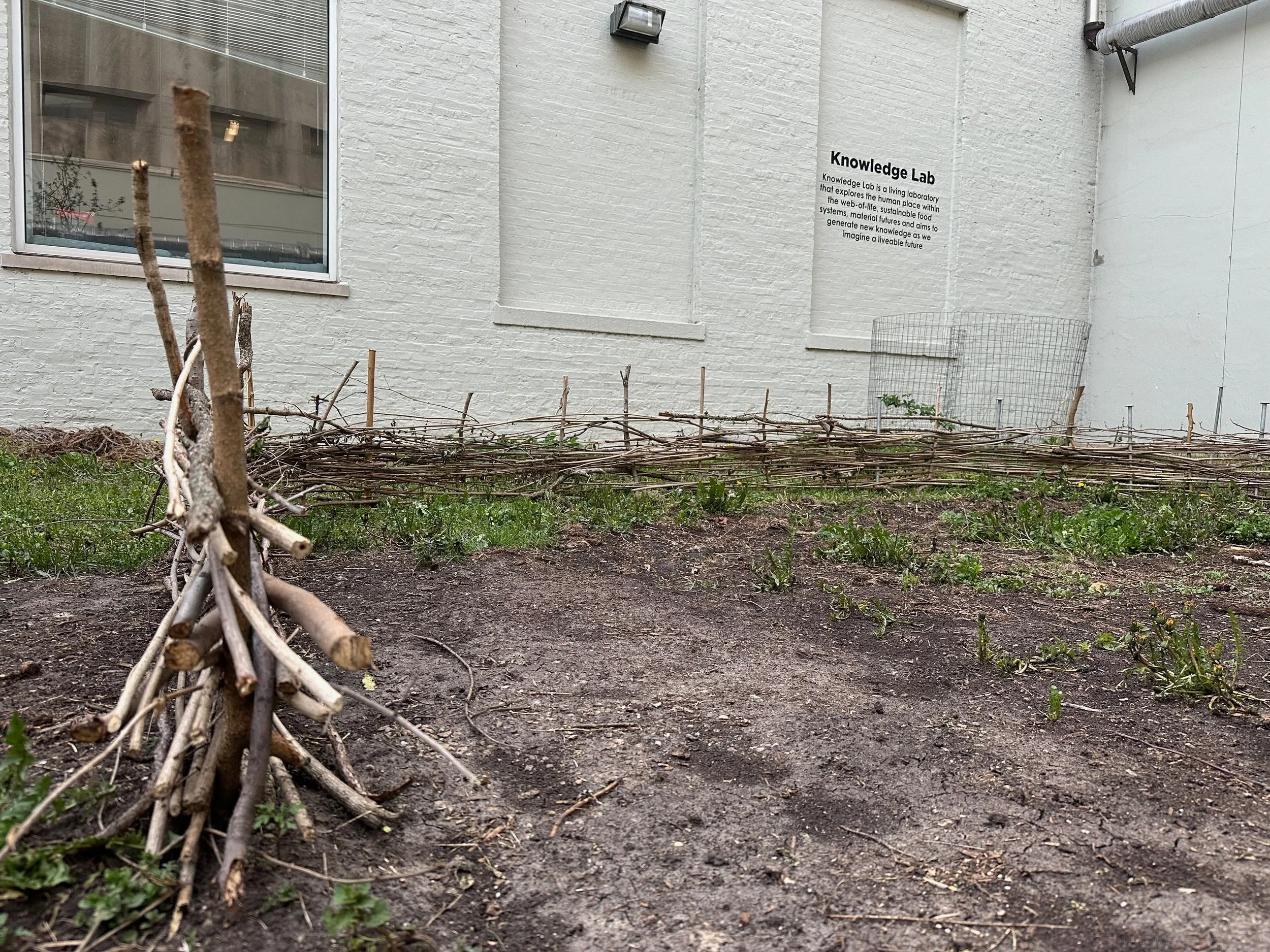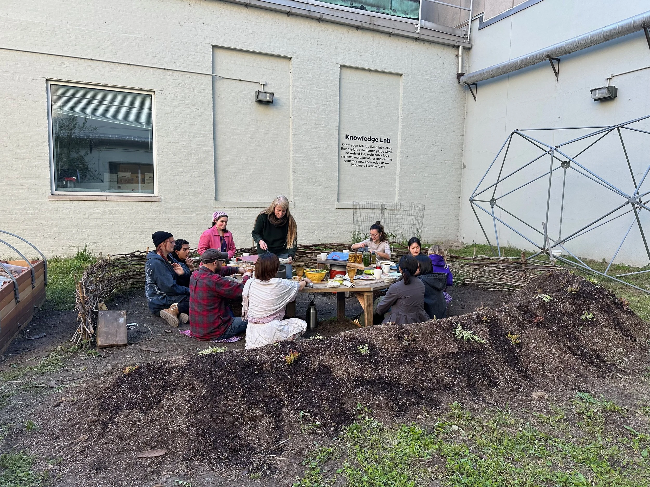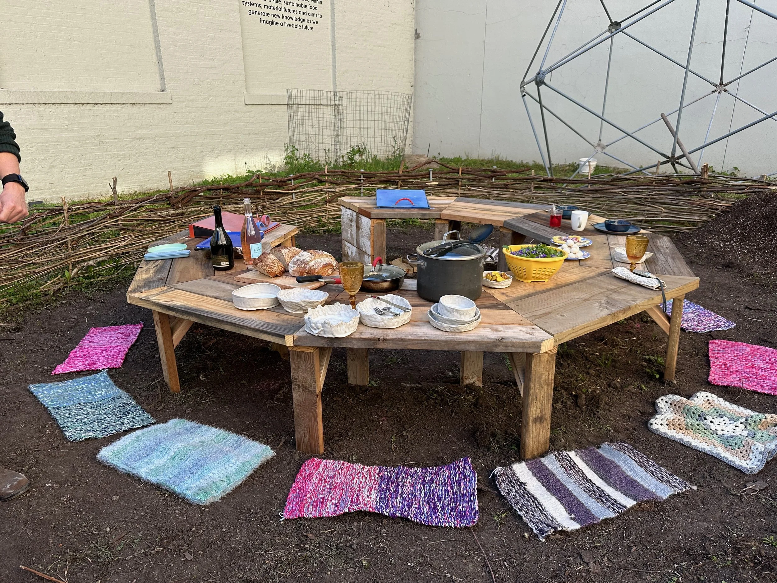In Sara Black’s Knowledge Lab: Entanglements course, we investigated the entanglements between humans and the natural world, working collaboratively to design and fabricate furniture, tableware, and a site for a meal to take place. Every aspect of the design considers the non-human organisms that also inhabit the space. We built a table from reclaimed wood, a wattle fence with willow branches, and we planted a garden that would continue to flourish and feed the community through the growing season. We harvested and processed clay at Oxbow, which we used to make the vessels we ate from. We foraged for food in Forest Park, grew mushrooms, and prepared our meal together. Built into the structure of the table are two bins for vermicompost.