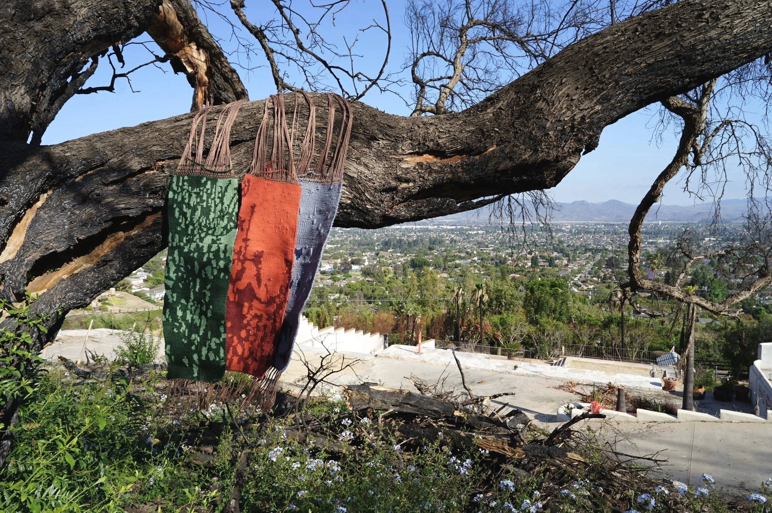 Replicated from an image my grandfather took of my family’s home before the Mountain Fire burned it down in November 2024, this 3-panel tapestry depicts a shadow cast by the Loquat tree on the side of the house. Each panel represents a different stage in the Loquat tree’s transition between life and death.